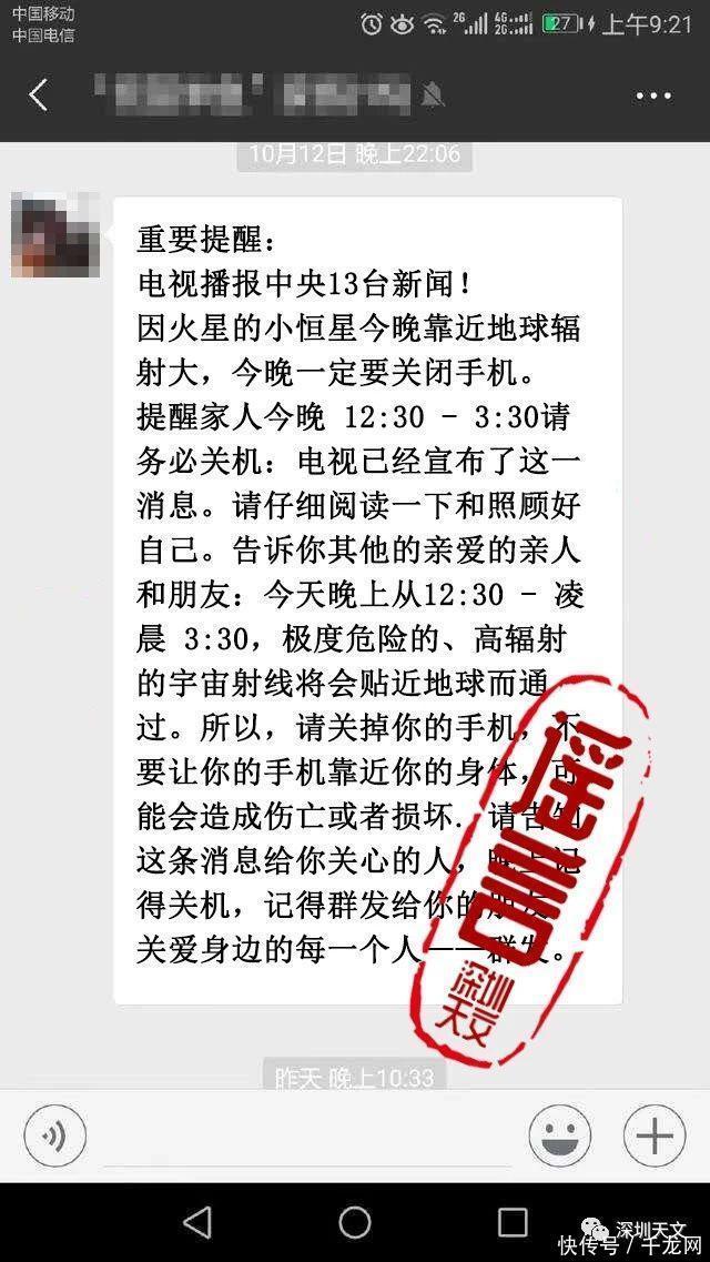 近日,一条内容为“火星的小恒星今晚靠近地球,辐射大,提醒家人今晚务必关手机”的消息在不少人的微信群及朋友圈里被广泛传播,引起不少网友的恐慌。